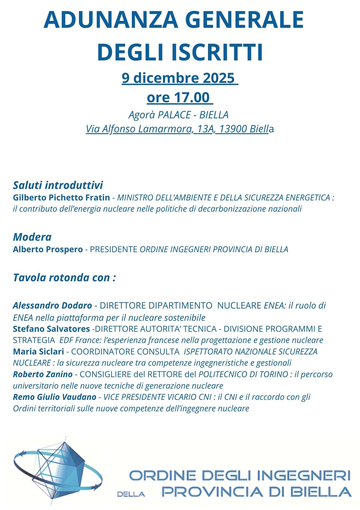 IN DATA 09/12/2025 PRESSO HOTEL AGORA’ PALACE BIELLA IN OCCASIONE DELLA ADUNANZA GENERALE convocata alle ore 14.00 SI TERRA’ IL SEMINARIO “IL RUOLO DELL’ATOMO NELLA NEUTRALITA’ CLIMATICA”